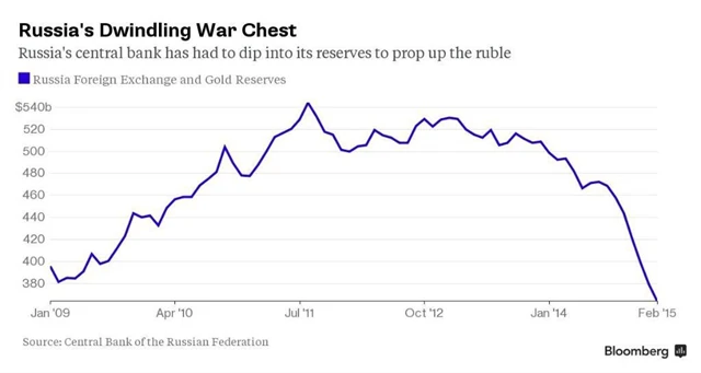 Výrazně negativně na slábnoucí ruské hospodářství reaguje také rubl, který se loni navzdory masivním intervencím ruské centrální banky k dolaru propadl o 41 % a k euru oslabil o 34 %. Loni banka na záchranu měny vynaložila 76,1 miliardy USD a 5,4 miliardy EUR a ani letos zatím s vyprazdňováním svých sejfů s cílem podpořit rubl neustává.