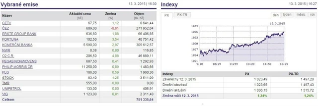 Za celý uplynulý týden akcie na pražské burze nepatrně oslabily, index PX klesl o 0,1 % na 1 036,15 bodu. Index je tak stále blízko úrovně, kde byl naposledy v červnu 2014. Největší růst vykázaly akcie telekomunikační společnosti O2 Czech Republic, největší pokles naopak postihl cenné papíry těžební firmy NWR. V předchozím týdnu akcie na pražské burze stouply přes procento.
