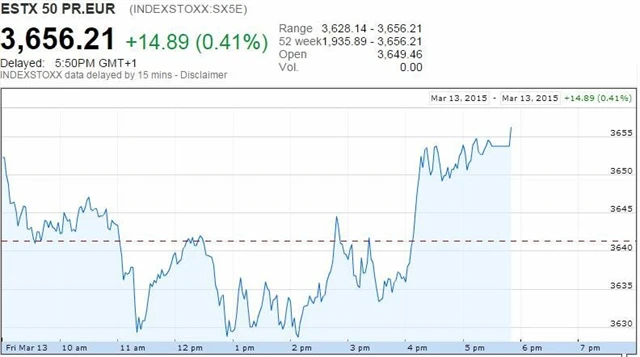 - Evropská centrální banka v pondělí zahájila program kvantitativního uvolňování nákupem německých dluhopisů. Informovaly o tom dva nejmenované zdroje. Centrální banky zemí eurozóny podle dvou traderů pohybujících se na dluhopisových trzích v pondělí začaly nakupovat německé dluhopisy. Mluvčí ECB zprávu odmítl komentovat, zatímco dluhopisy zažívají rally. Výnos německých 10letých dluhopisů v reakci na zprávu klesl o 4 bazické body na 0,35 % a přiblížil se rekordnímu minimu 0,283 % dosaženému 26. února. Výnos italských desetiletých dluhopisů rovněž spadl o 4 bazické body, a to na 1,28 %.