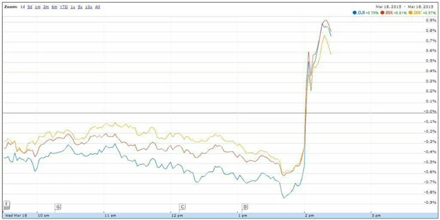 Analytici dosud očekávali, že Fed začne úrokové sazby zvyšovat již na červnovém zasedání. Po jeho středečním vyjádření ale z vývoje na trhu krátkodobých sazeb plyne, že většinová očekávání prvního růstu úroků se odsouvají na říjen, uvedla agentura Reuters. To výrazně posílilo americké akcie, jejichž indexy se přehouply ze ztrát do kladného pásma. Rovněž výrazně oslabil dolar.