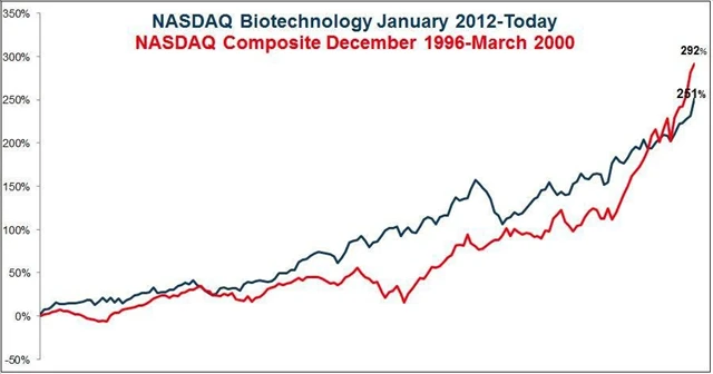 Michael Batnick obě situace srovnal do jednoho grafu. "Od začátku roku 2012 (168 týdnů) biotechnologie posílily o 250 %. Nasdaq Composite za stejnou dobu před vrcholem bubliny v roce 2000 narostl o 290 %. Růst Nasdaqu navíc zrychloval mnohem více, graf byl před vrcholem strmější, než je nyní křivka sledující ceny akcií biotechnologických společností," uvedl. Celkově tak podle něj má odvětví ještě prostor růst, ačkoli ocenění i zhodnocení se již blíží velice spekulativním úrovním.