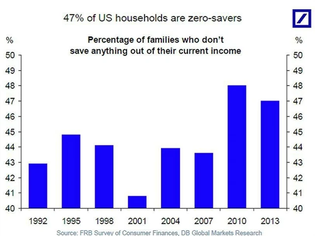 Poslední ekonomická data ze Spojených států dokazují, že oživování americké ekonomiky pokračuje, byť existují i oblasti, ve kterých má hospodářství stále co dohánět. Alarmující je nicméně pohled na následující graf, který ukazuje, kolik domácností v USA ze svých pravidelných příjmů neuspoří ani dolar.