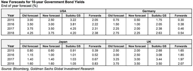 Americká investiční banka snížila výhled na konec letošního roku pro výnos 10letých vládních dluhopisů USA z 3 % na 2,5 %. Nižší úroky predikuje nově i na dalších trzích. Důvody jsou poptávka centrálních bank (ECB, Bank of Japan) nebo omezení některých fondů při obchodování s bondy (musejí je často držet do splatnosti, i když výnosy klesají, takže nabídka dluhopisů na trhu neroste tak rychle).