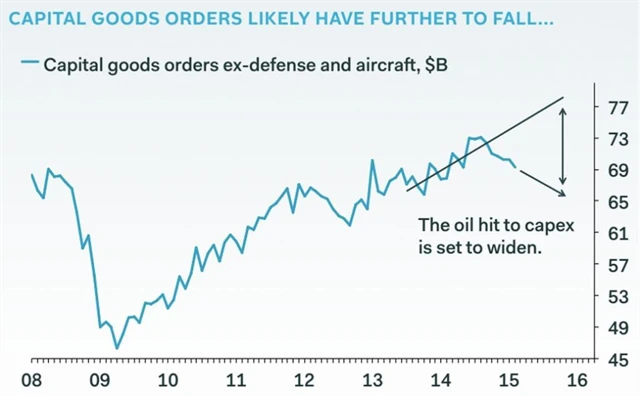 Výrazné omezování kapitálových výdajů světových těžařů ropy se mimo jiné znatelně projevuje i v objednávkách nových výrobních zařízení. Jak nedávno upozornil Ian Shepherdson z Pantheon Macroeconomics, za tři měsíce do konce února výdaje firem na nákup výrobních prostředků klesly o 7,6 % anualizovaně. V této statistice jsou přitom zahrnuty výdaje všech firem, což dokazuje, jak moc si těžaři musejí utahovat opasky.