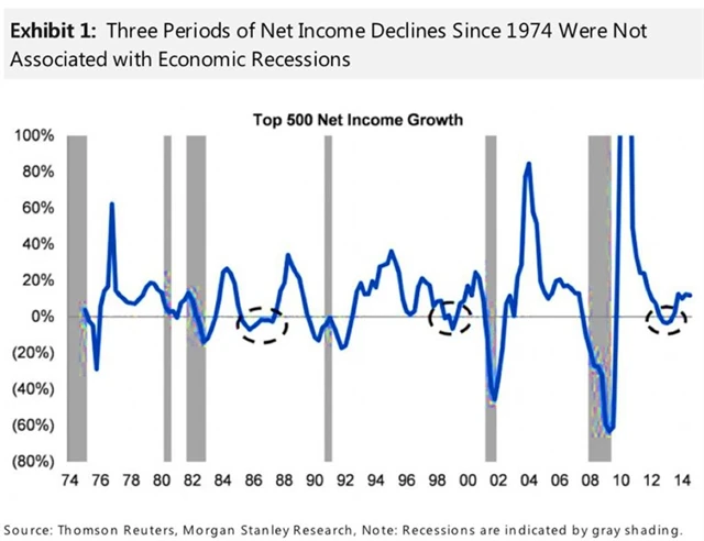 Od roku 1974 nastaly na americkém trhu tři období, kdy zisky firem klesaly více kvartálů za sebou bez toho, že by to bylo v návaznosti na recesi ekonomiky (1986, 1998, 2012). Index S&P 500 ve všech třech případech rok předtím rostl a během období poklesu zisků akcie zdražovaly také. "Akcie oslabily pouze ve 3 z 16 čtvrtletí, kdy klesaly zisky," upozorňuje Adam Parker z Morgan Stanley.