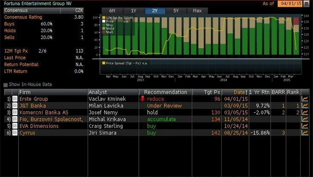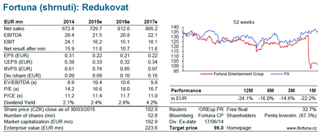 "Z důvodu zrušení manipulačního poplatku na online sázení na Slovensku a růstu daní v České republice snižujeme naši cílovou cenu ze 142 Kč na akcii na 96 Kč na akcii. Vzhledem k současné ceně akcie také snižujeme doporučení z akumulovat na redukovat," napsal Václav Kmínek, analytik z České spořitelny. Negativní dopad zrušení manipulačního poplatku na Slovensku by dle Fortuny mohl dosáhnout až 6 milionů eur ročně.