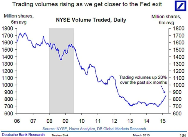 Akcie každopádně měly tendenci posilovat za nižšího objemu obchodů, a naopak ztrácet za vyššího objemu. Aktuální růst aktivity na trhu tak může být varovným znamením. Podle Torstena Sloka z Deutsche Bank může současný růst aktivity souviset s přípravami investorů na normalizaci měnové politiky Fedu a s tím spojenou volatilitu.