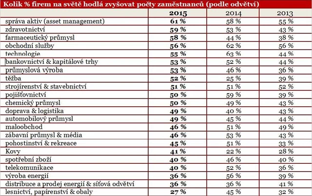 Mezi českými firmami je více než polovina (55 %) těch, které letos plánují nabírat. Loni jich bylo 44 %. Naopak 18 % českých firem plánuje v roce 2015 stavy zaměstnanců snižovat, ještě loni jich bylo 28 %.