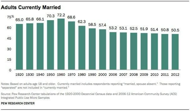 Zatímco počet nově uzavřených manželství se od konce recese konečně začal zvedat, celkový počet vdaných a ženatých jedinců ve Spojených státech i tak klesl na současných 50,5 %, což je vůbec nejnižší úroveň v historii země. Celých 20 % lidí nad 25 let věku nebylo nikdy ve svazku manželském. To je oproti roku 1960 dvojnásobek.