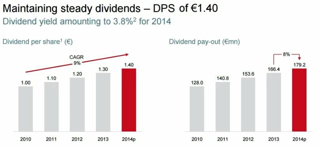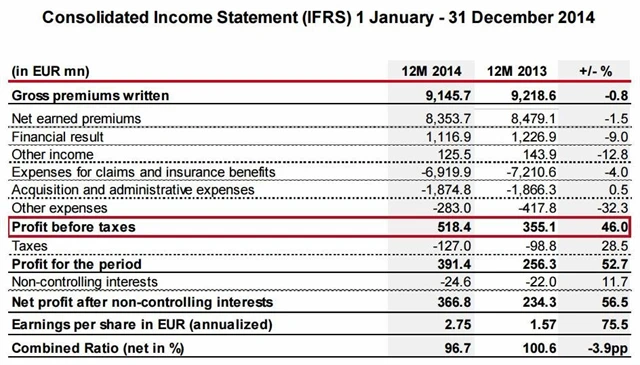Bez vyloučení vlivu kurzových výkyvů se pojišťovně hrubé předepsané pojistné oproti předchozímu roku snížilo o 0,8 %. Zisk po zdanění se společnosti meziročně zvýšil o 56,5 % na 366,8 milionu eur a zisk na akcii jí oproti roku 2013 stoupl o 75,5 %. Výrazný nárůst zisku na akcii na 2,75 eura byl podle pojišťovny mimo jiné způsoben i vydáním podřízeného dluhopisu na konci roku 2013, který jí pomohl k optimalizaci kapitálové struktury.