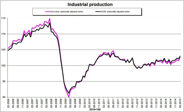 Průmyslová produkce eurozóny v únoru vzrostla meziměsíčně o 1,1 %, očekával se 0,4% růst po lednovém poklesu o 0,3 % (revidováno z -0,1 %). Meziročně se průmyslová výroba v eurozóně zvýšila o 1,6 % při očekávání 0,8% růstu po lednových 1,2 %. V celé Evropské unii se produkce meziměsíčně zvedla o 0,9 % po 0,3% poklesu v lednu a meziročně se zvýšila o 1,4 %.