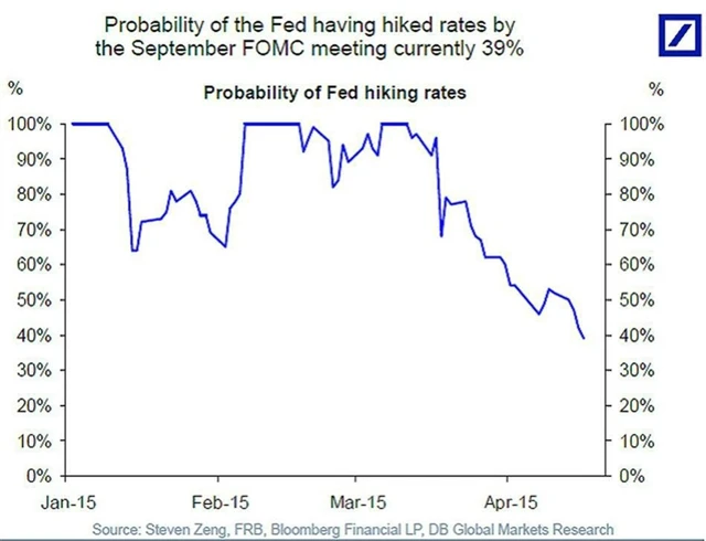 Podle analytika z Deutsche Banka Torstena Sloka existuje jen 39% pravděpodobnost toho, že Fed přistoupí k prvnímu zvýšení sazeb ještě před zářijovým zasedáním.
