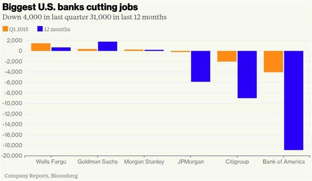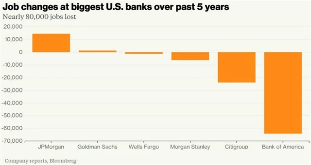 Šest největších amerických bank podle agentury Bloomberg v posledních pěti letech zrušilo kolem 80 tisíc pracovních míst.
