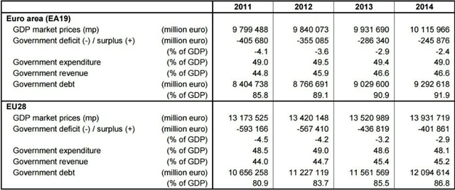 V roce 2014 klesl oproti roku 2013 deficit rozpočtu eurozóny i celé Evropské unie, zatímco zadlužení vzrostlo. Deficit v eurozóně se snížil na 2,4 % HDP z 2,9 % HDP v roce 2013 a v celé Evropské unii klesl na 2,9 % HDP z 3,2 % HDP. Naopak vládní dluh se v eurozóně zvýšil na 91,9 % HDP z 90,9 % HDP v roce 2013 a v celé EU na 86,8 % HDP z 85,5 % HDP.