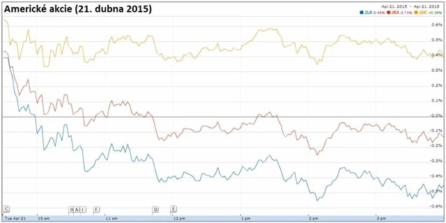 Dow oslabil o 0,47 % na 17 949,59 bodu a S&P 500 odepsal 0,15 % na 2 097,29 bodu, zatímco technologický Nasdaq zpevnil o 0,39 % na 5 014,10 bodu. Index volatility VIX se prakticky nezměnil, klesl o 0,38 % na 13,25 bodu. Výnos 10letého vládního dluhopisu USA se zvýšil o dva bazické body na 1,91 %.