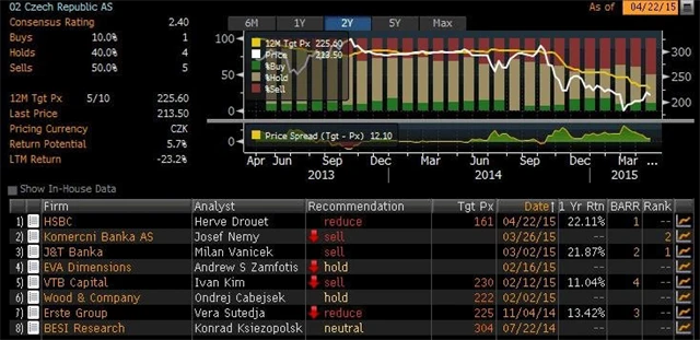 HSBC snížila cílovou cenu O2 Czech Republic na 161 korun ze 190 korun. Doporučení revidovala na "redukovat" z "underweight".