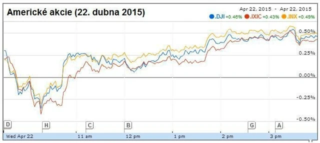 Americké akciové trhy ve středu zpevnily a přiblížily se historickým maximům. Trh podpořily solidní čtvrtletní výsledky společností Coca-Cola a McDonald's, pomohl také růst cen akcií Visa a MasterCard. Po uzavření obchodování zveřejnily výsledky za první kvartál mimo jiné společnosti Facebook, eBay či AT&T.