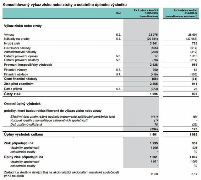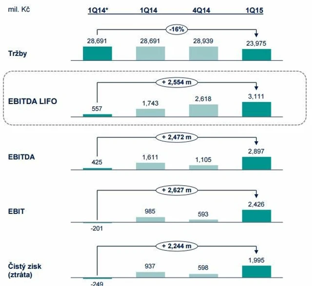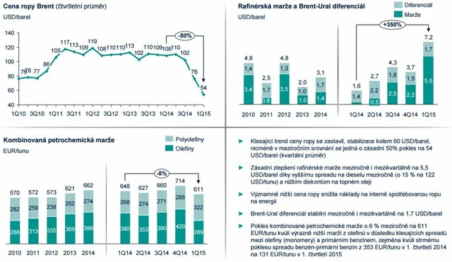 "Unipetrol ve čtvrtek reportoval výsledky za první čtvrtletí, které byly díky vysokým rafinérským maržím nejlepší za posledních 6 let. Tržby v důsledku 50% poklesu cen ropy meziročně klesly o 16 % na 23,98 miliardy Kč, zisk EBITDA LIFO ale vzrostl na 3,11 miliardy Kč a překonal odhadovaných 2,67 miliardy Kč," napsali Renáta Ďurčová a Tamás Pletser, analytici z Erste Group. "Segment zpracování ropy (rafinérie a petrochemie) se na provozním zisku podílel 2,99 miliardy Kč (meziroční zlepšení o 2,54 miliardy Kč) a maloobchodní segment vzrostl o 35 milionů Kč na 135 milionů Kč, což je pod naším očekáváním, a to především kvůli sezónně nižším objemům. Zisk EBIT dosáhl 2,43 miliardy Kč a čistý zisk 1,995 miliardy Kč (nad konsenzem analytiků podle Reuters 1,59 miliardy Kč). Celkově byly výsledky Unipetrolu silné. Vedle vysokých rafinérských marží firmě pomohla i akvizice podílu společnosti ENI v České rafinérské. Očekáváme pokračování silných výsledků po několik dalších čtvrtletí."