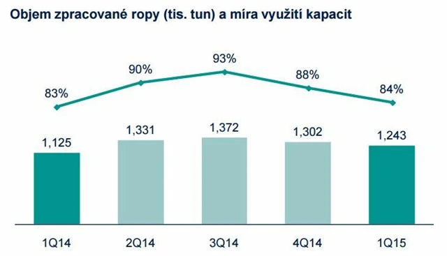 Využití rafinérských kapacit dosáhlo 84 %. Negativně ho ovlivnila zimní sezónnost a plánovaná odstávka rafinérie v Kralupech v druhé polovině března. Objem zpracované ropy v rafinérské části vzrostl o 10 % na 1,24 miliardy tun. Prodejní objemy rafinérských produktů meziročně vzrostly o 15 %.