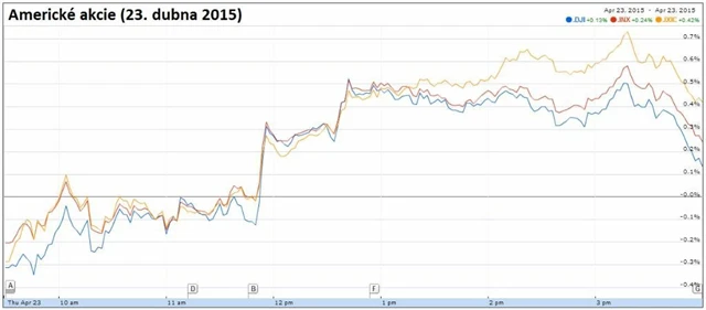Nedařilo se akciím automobilky General Motors (-3,34 %), jejíž výsledky zaostaly za odhadem trhu. Firma oznámila, že v letošním prvním čtvrtletí hospodařila se ziskem 0,86 USD na akcii pod očekáváním trhu 0,97 USD na akcii. Tržby firmy na úrovni 35,7 miliardy dolarů na odhad trhu 37,6 miliardy dolarů taktéž nestačily.
