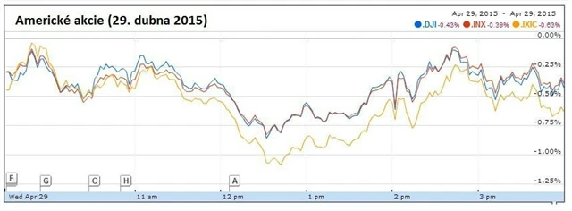 Obchodování na amerických akciových trzích ve středu ovlivnila především zpráva o slabém růstu ekonomiky USA v prvním čtvrtletí letošního roku. Cenné papíry ale dolů stahovaly také neuspokojivé hospodářské výsledky některých firem.