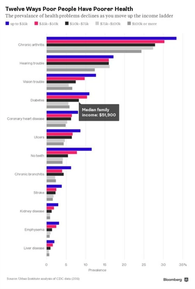Studie analyzovala výskyt celkem 12 zdravotních problémů (například chronické artritidy, potíží se sluchem, cukrovky nebo vypadávání zubů) ve skupinách lidí seřazených podle výše rodinného příjmu. Výsledek je zřejmý - bohatí z toho vycházejí lépe. Jen s pár výjimkami (které nejspíše potvrzují pravidlo) se zdravotní stav zlepšuje, čím výše šplháte po žebříčku příjmů.