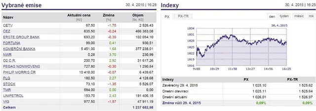Index PX ve čtvrtek v posledním obchodním dni týdne připsal 0,09 % na 1 026,01 bodu. V pátek zůstane pražská burza kvůli Svátku práce zavřená. Za celý zkrácený týden index PX odepsal 1,5 % a od začátku dubna klesl o 0,74 %. Index PX-TR, zohledňující i vyplacené dividendy, ale za měsíc necelé procento přidal.