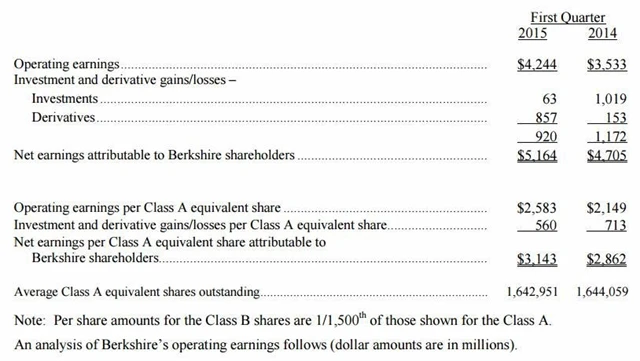 V přepočtu na jednu akcii činil provozní zisk za období od ledna do března 2 583 USD. O rok dříve to bylo 2 149 USD. Účetní hodnota firmy přepočtená na jednu akcii se oproti poslednímu čtvrtletí loňského roku zvýšila o 0,5 % na 146 963 dolarů.