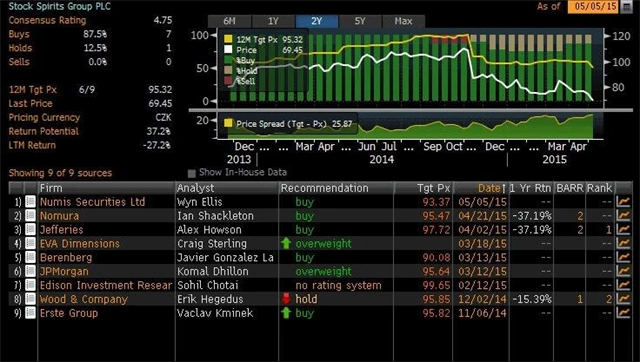 Společnosti Numis Securities snížila cílovou cenu akcií likérky Stock Spirits na 92,90 Kč ze 120,40 Kč. Doporučení nicméně ponechala "buy". Akcie likérky na zprávu reagují výrazným zlevňováním.