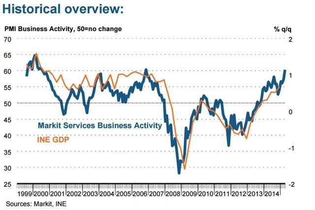 Aktivita španělského sektoru služeb v dubnu opět zrychlila, tentokrát dokonce nečekaně výrazně. Index nákupních manažerů vyskočil na 60,3 bodu z březnových 57,3 bodu, očekával se přitom mírnější růst na 57,4 bodu. Nové zakázky rostly nejprudčeji od roku 2000 a zaměstnanost v sektoru se zvýšila nejvíce za více než sedm let. Kompozitní index se zvýšil na 59,1 bodu z 56,9 bodu. Situace ve zpracovatelském sektoru se v dubnu naopak mírně zhoršila, index zde klesl na 54,2 bodu z březnových 54,3 bodu.