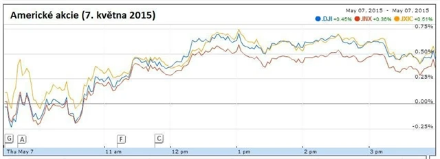 Index Dow uzavřel čtvrteční obchodování s nárůstem o 0,46 % na 17 924,06 bodu, širší index S&P 500 posílil o 0,38 % na 2 088 bodů. Technologický Nasdaq připsal 0,53 % na 4 945,54 bodu. Index volatility VIX klesl o 0,13 % na 15,13 bodu a výnos 10letých vládních dluhopisů USA klesl o šest bazických bodů na 2,18 %.