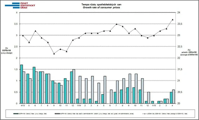 Meziročně vzrostly spotřebitelské ceny v dubnu o 0,5 %, což je o 0,3 procentního bodu více než v březnu. Zrychlení meziročního cenového růstu nastalo především v oddíle alkoholické nápoje a tabák, kde ceny alkoholických nápojů vzrostly o 2,5 % (v březnu pokles o 0,1 %). V oddíle bytové vybavení, zařízení domácnosti přešly ceny z poklesu o 0,2 % v březnu v růst o 0,3 % v dubnu zejména vlivem cen nábytku a bytového zařízení, které byly v dubnu vyšší o 0,6 % (v březnu pokles o 0,2 %). U třech oddílů spotřebního koše došlo ke zmírnění meziročního cenového poklesu, a tím i ke zmírnění jeho snižujícího vlivu na úroveň cenové hladiny. To se týkalo především cen v oddíle potraviny a nealkoholické nápoje, které v dubnu klesly o 0,7 % (v březnu o 1,9 %). Ceny ovoce byly nižší o 1,3 % (v březnu o 5,2 %), ceny cukru o 15,6 % (v březnu o 17,3 %). U zeleniny přešly ceny z poklesu o 6,7 % v březnu v růst o 3,8 % v dubnu. V oddíle doprava došlo ke snížení cenového poklesu vlivem zmírnění poklesu cen pohonných hmot v dubnu na -11,1 % z -12,7 % v březnu. V oddíle zdraví zmírnil v dubnu cenový pokles vlivem zvýšení cen lázeňských pobytů na 8,6 % ze 7,1 % v březnu.