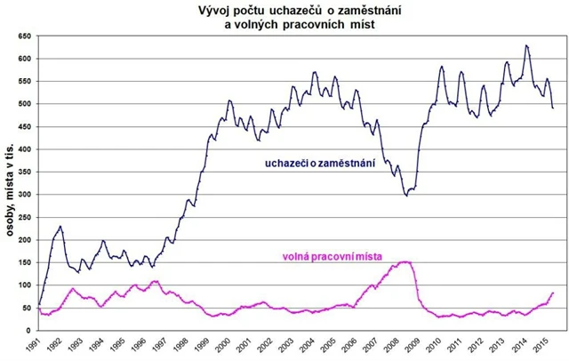 Podíl nezaměstnaných osob, tj. počet dosažitelných uchazečů o zaměstnání ve věku 15 - 64 let k obyvatelstvu stejného věku k 30. 04. 2015 poklesl na 6,7 % (březen 2015: 7,2 %, duben 2014: 7,9 %. Podíl nezaměstnaných stejný nebo vyšší než republikový průměr vykázalo 31 okresů, nejvyšší byl v okresech Most (12,3 %), Bruntál (11,9 %), Ústí nad Labem (11,8 %), Karviná (11,7 %), Ostrava–město (10,7 %), Chomutov (10,4 %) a Děčín (9,6 %). Nejnižší podíl nezaměstnaných byl zaznamenán v okresech Praha-východ (3,1 %), Rychnov nad Kněžnou (3,6 %), Benešov (3,8 %), Rokycany (3,9 %), Mladá Boleslav (4,0 %), Prachatice a Pelhřimov (shodně 4,1 %). Podíl nezaměstnaných mužů poklesl na 6,6 % a podíl nezaměstnaných žen poklesl na 6,9 %.
