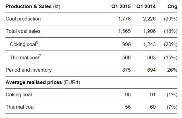 Průměrná cena koksovatelného uhlí v prvním čtvrtletí dosáhla 90 EUR za tunu (meziročně -1 %). Cena termálního uhlí se meziročně snížila o 7 % na 56 EUR za tunu. Náklady na těžbu dosáhly v průměru 71 EUR za tunu, meziročně se tak zvýšily o 7 %. Produkce uhlí o pětinu klesla a dosáhla 1,8 milionu tun. Prodeje uhlí se snížily o 18 % na 1,6 milionu tun. Produktový mix byl tvořen z 64 % z koksovatelného uhlí a ze 36 % z termálního uhlí.