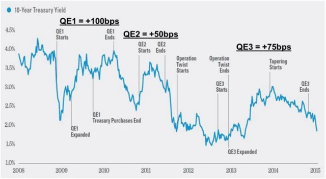 Jedno vysvětlení růstu výnosů bondů je empirické. Po začátku kvantitativního uvolňování v USA výnosy amerických státních dluhopisů také měly tendenci korigovat předchozí poklesy. Po QE1 vzrostly o zhruba 100 bazických bodů, po QE2 o 50 bazických bodů a po QE3 o 75 bazických bodů. Přesto postupně poklesly asi o 160 bazických bodů z 3,7 %.