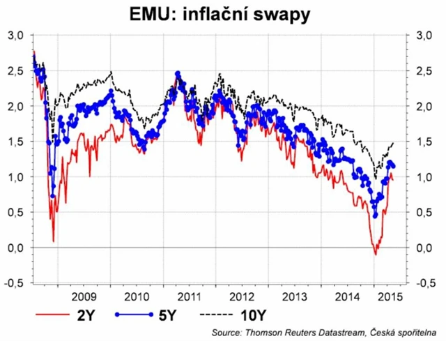 Evropské dluhopisy navíc zaspaly. Zatímco inflační očekávání vzrostla od začátku roku o 50 bazických bodů, výnosy o téměř 50 bazických bodů poklesly.