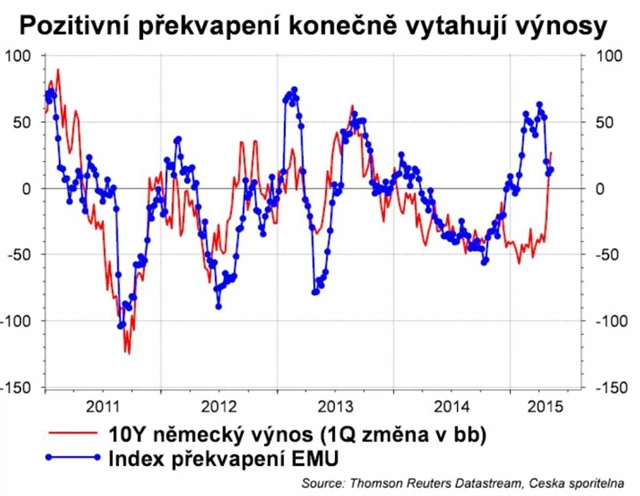 A ještě můj oblíbený graf s překvapeními. Jak jsme již na konci roku upozorňovali, trh byl nastaven příliš pesimisticky ohledně růstu v eurozóně, protože podceňoval vliv slabého eura a nízkých cen ropy. Proto byl trh celé první čtvrtletí pozitivně překvapován. V minulosti byla pozitivní překvapení doprovázena růstem výnosů, což se tentokrát nedostavilo hned, pravděpodobně kvůli očekávání kvantitativního uvolňování ECB. Nakonec nicméně růst přišel.