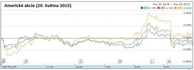 Americké akcie v průběhu středy převážně oscilovaly okolo nuly, větší pohyb vyvolalo pouze zveřejnění zápis z posledního jednání FOMC. Níže ceny tlačily zejména neuspokojivé hospodářské výsledky některých významných firem. Po zveřejnění zápisu z dubnového zasedání centrální banky sice trhy v USA výrazně ožily, když investory povzbudila zpráva, že červnové navýšení úrokových sazeb není pravděpodobné, v závěru obchodování ale většina akcií svůj růst opět stáhla.