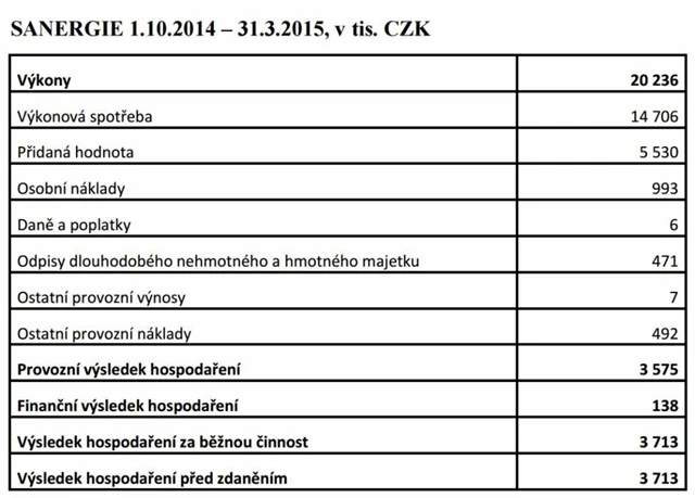 Dceřiná SANERGIE nicméně v období od října 2014 do března 2015 vydělala 3,713 milionu korun před zdaněním. Na provozní úrovni SANERGIE dosáhla zisku 3,757 milionu korun. "Výsledek za uvedené období není překvapujícím číslem a odpovídá přibližně hospodářskému výsledku srovnatelného období minulého roku (je o 4,6 % nižší)," poznamenala společnost E4U.