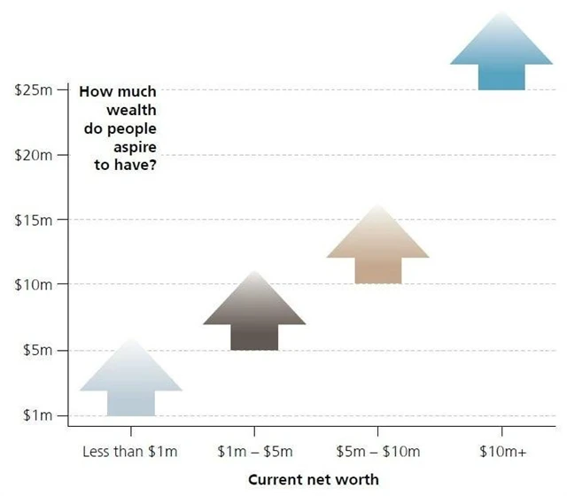 UBS došla na základě ankety mezi svými váženými klienty k závěru, že čím více peněz lidé mají, tím bohatší by chtěli být. "U lidí s majetkem v hodnotě nad pět milionů dolarů s růstem bohatství roste i jejich životní satisfakce, zároveň ale platí, že velká část milionářů touží po stále větším bohatství, jelikož nákladnější životní styl vyžaduje stále více peněz," píše banka ve výstupu z ankety.