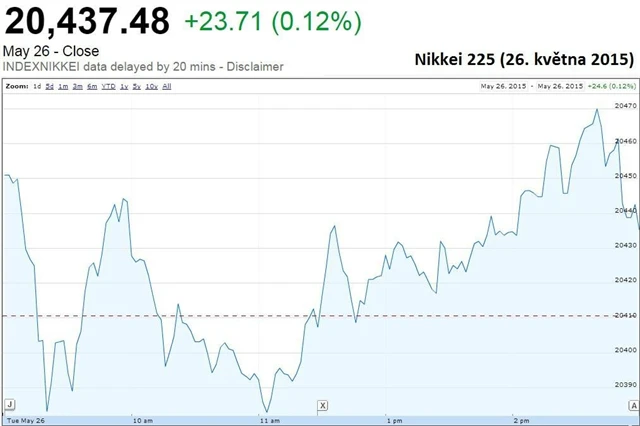 Japonský Nikkei 225 připsal 0,12 %. Posiluje již osmou seanci v řadě a posunul zároveň své patnáctileté maximum. V průběhu seance se index pohyboval pod nulou poté, co po zahájení obchodování vyskočil na patnáctiletý rekord 20 456 bodů, v poslední hodině však ztrátu zvrátil a podařilo se mu vyšplhat se nad nulu.