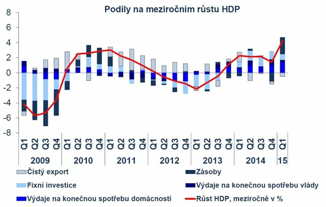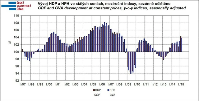 Zpřesněný odhad potvrdil, že česká ekonomika na počátku letošního roku významně zrychlila svůj růst. Hrubý domácí produkt očištěný o cenové vlivy a sezónnost vzrostl v 1. čtvrtletí meziročně o 4,2 %. Ve srovnání s posledním čtvrtletím roku 2014 se HDP reálně zvýšil o 3,1 %. Na tento výrazný mezičtvrtletní růst HDP měl vliv vysoký růst hrubé přidané hodnoty a nerovnoměrný výběr spotřební daně z tabákových výrobků, který ovlivnil srovnávací základnu v roce 2014.