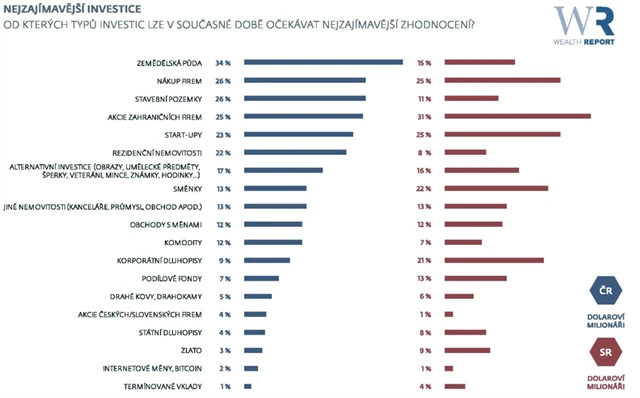 Neustálé snižování úrokových sazeb centrálními bankami nutí investory hledat zajímavější zhodnocení finančních prostředků v jiných než vkladových produktech. Ze společné perspektivy českých i slovenských dolarových milionářů vychází jako zajímavé investice do akcií zahraničních firem (25 % v ČR, 31 % v SR), nákup firem (26 % v ČR, 25 % v SR) a startupy (23 % v ČR, 25 % v SR).