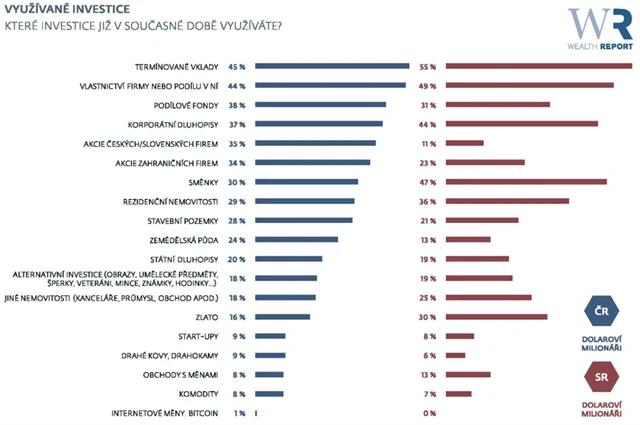 V portfoliu dolarových milionářů najdeme zejména investice, od kterých bohatí očekávají nejzajímavější zhodnocení. Výjimkou jsou jen termínované vklady, které za atraktivní z hlediska výnosu považuje pouze 1 % českých dolarových milionářů, ale v portfoliu je má téměř polovina oslovených (45 % v ČR, 55 % v SR). Vysoko si stojí vlastnictví firmy nebo podílu v ní, dolaroví milionáři tedy častěji investují do svých vlastních firem než do ostatních investičních nástrojů.