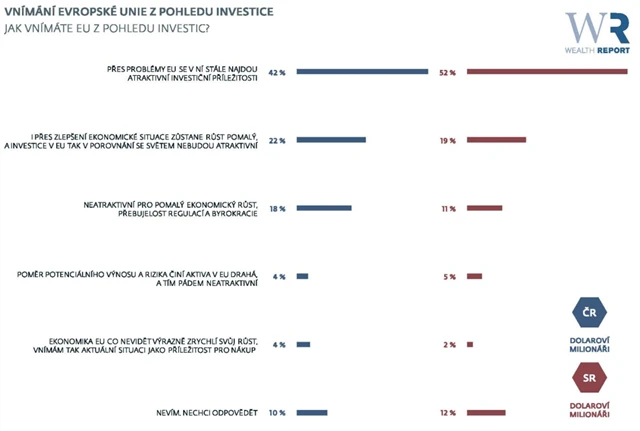 Evropská unie je pro dolarové milionáře z pohledu investic místem, kde se i přes problémy stále najdou atraktivní investiční příležitosti (42 % v ČR, 52 % v SR). Češi jsou ohledně investičních příležitostí v EU mírně skeptičtější. Přibližně pětina dolarových milionářů očekává i přes zlepšení ekonomické situace velmi pomalý růst, což činí investice v unii méně atraktivními v porovnání se světem, dokonce 4 % českých a 5 % slovenských milionářů označilo aktiva v EU za drahá a neatraktivní s ohledem na poměr mezi výnosy a riziky. 18 % českých a 11 % slovenských dolarových milionářů označilo investice v EU za neatraktivní kvůli pomalému ekonomickému růstu, přebujelosti regulací a byrokracie. Málokdo ale věří, že lze v EU očekávat všeobecný rychlý růst.