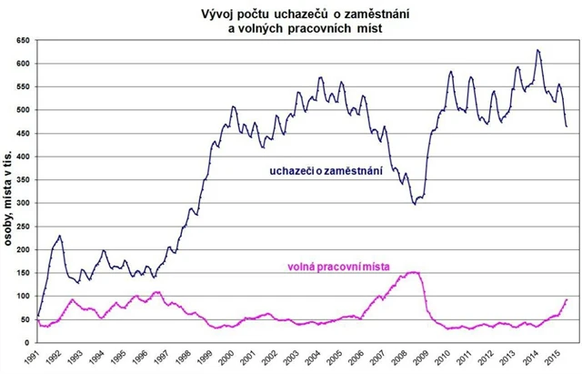 K 31. květnu 2015 evidoval Úřad práce ČR (ÚP ČR) na svých krajských pobočkách a jejich kontaktních pracovištích celkem 465 689 uchazečů o zaměstnání. Jejich počet byl o 25 896 nižší než na konci předchozího měsíce, ve srovnání se stejným obdobím roku 2014 je nižší o 84 284 osob. Z tohoto počtu bylo 448 359 dosažitelných uchazečů o zaměstnání ve věku 15 – 64 let . Bylo to o 25 017 méně než na konci předchozího měsíce. Ve srovnání se stejným obdobím roku 2014 byl jejich počet nižší o 85 983.