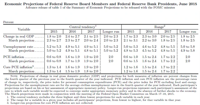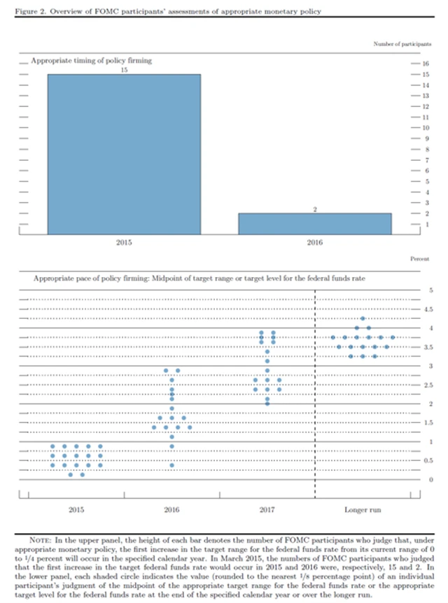 Drtivá většina FOMC předpokládá letošní zvyšování sazeb. Rozložení sil a očekávání ohledně vývoje základního úroku v dalších letech ukazují dva grafy z prohlášení ze zasedání. Výhled růstu základní sazby v letech 2015 a 2016 se v průměru (medián) snížil o čtvrt procentního bodu. To může signalizovat menší důvěru v růst ekonomiky USA a menší jistotu ohledně výše sazby, kterou by guvernéři považovali za "normální". Centrální banka zopakovala, že pohyb sazby bude závislý na datech z ekonomiky. Místo výše úroku a přesného data její změny by Yellenová doporučovala sledovat celkový trend vývoje sazby. Růst úroku každopádně může být rychlejší i pomalejší, než aktuálně očekávají jednotliví guvernéři Fedu.