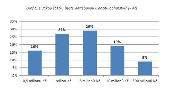 Čtvrtině Čechů by k pocitu bohatství stačil milion korun. Necelá třetina by se za bohaté považovala až s pěti miliony. Vyplývá to z průzkumu společnosti Pioneer Investments realizované ve spolupráci s agenturou STEM/MARK. Méně než každý desátý Čech by o sobě tvrdil, že je bohatý, až na hranici půl miliardy korun.