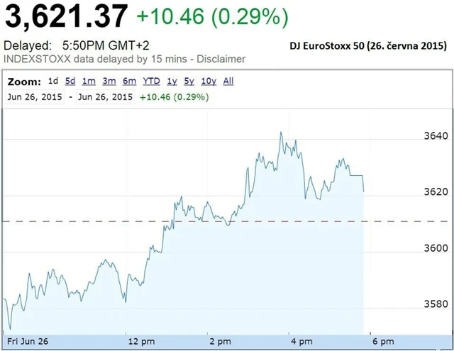- Řecká vláda předložila návrh dohody, která opět nesplňuje požadavky věřitelů. Řecko navrhuje 0,93% růst příjmů státu z DPH, věřitelé požadují 1% růst. Vláda chce mít sníženou 13% sazbu DPH na hotely, věřitelé požadují 23 %. Řecko navrhuje snížit vojenské výdaje v rozpočtu na rok 2016 jen o 200 milionů eur, věřitelé chtějí dvakrát tolik. Řecko navrhuje zavést jednorázovou 12% korporátní daň na zisky nad 500 tisíc eur, aby splnilo fiskální cíl pro rok 2015. Příjmy státu chce zvýšit zavedením 30% daně na hazard a prodejem licencí na 4G a 5G sítě.
