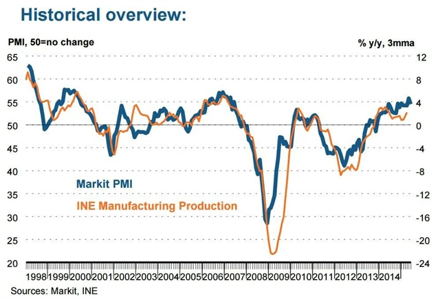 Španělsko: Index nákupních manažerů ve zpracovatelském sektoru v červnu klesl na 54,5 bodu (odhad: 55,5 bodu, květen: 55,8 bodu)